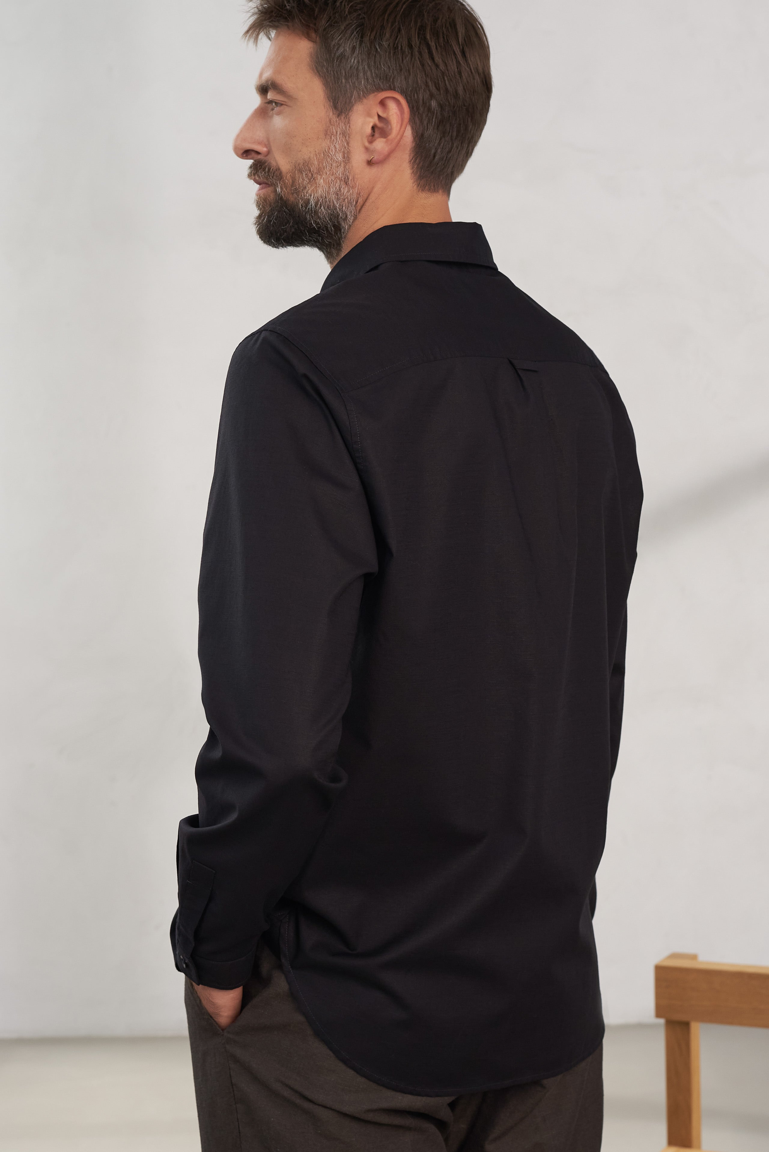 Ken is a casual, relaxed fitting companion. Cut in a wider shape and with a broad placket, the button-down collar is neatly topstitched. Due to its lower front neck this shirt works fastened up or worn open. The hem is curved and comes with triangle details at the side seam.