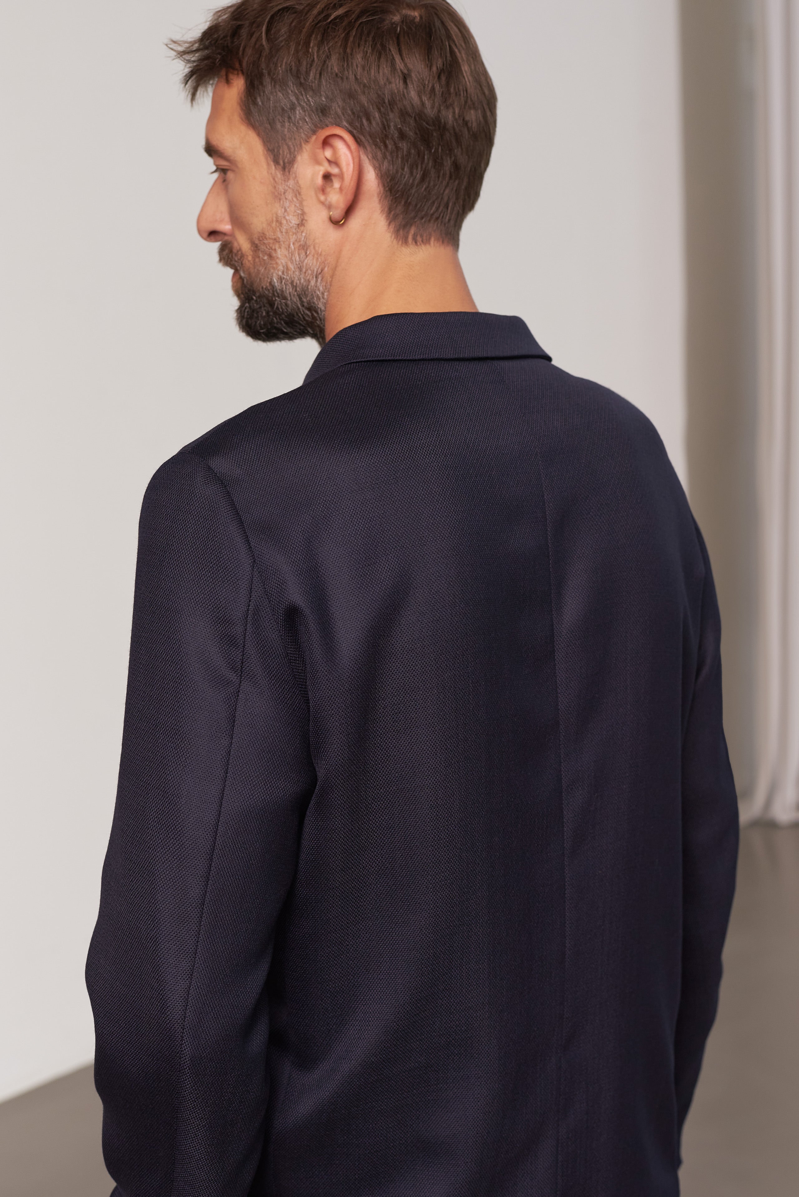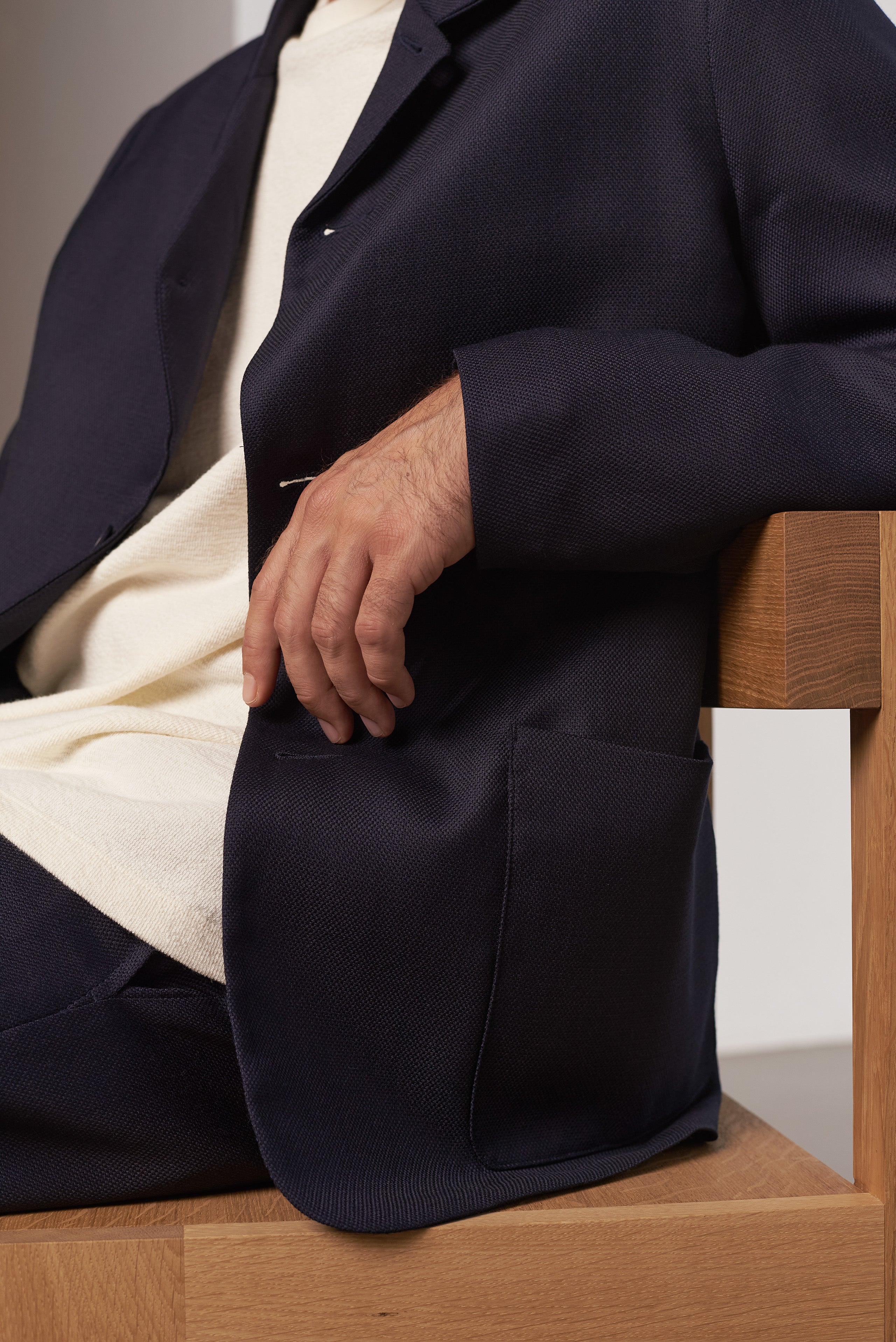 Dieses leichte Anzugsgewebe aus zertifizierter Wolle kombiniert fein versponnene Kammgarne mit einer luftigen Panama-Bindung. Das Ergebnis ist ein strukturierter Stoff mit elegantem Fall – ideal für die warme Jahreszeit. Gefüttert mit 100 % Tencel™ für zusätzlichen Komfort.