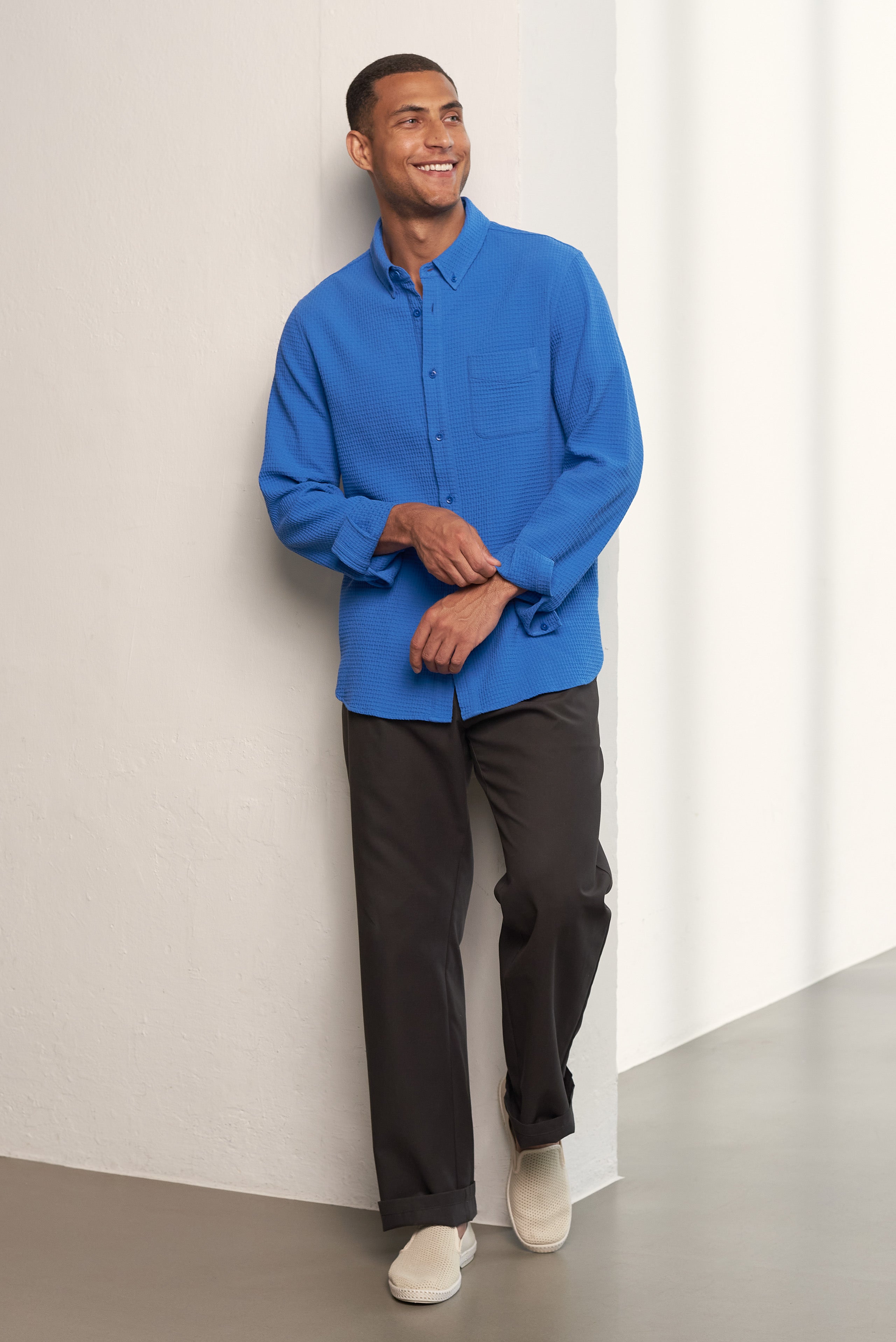 This button-down shirt made of certified organic cotton features a waffle structure fabric that is perfect for a variety of occasions, buttoned up or open over a t-shirt. It has a comfortable and straight fit with a round hem, as well as a chest pocket, back loop, and vegan buttons. Plus, it has been pre-washed to prevent shrinking at home and comes with a Repair guarantee.