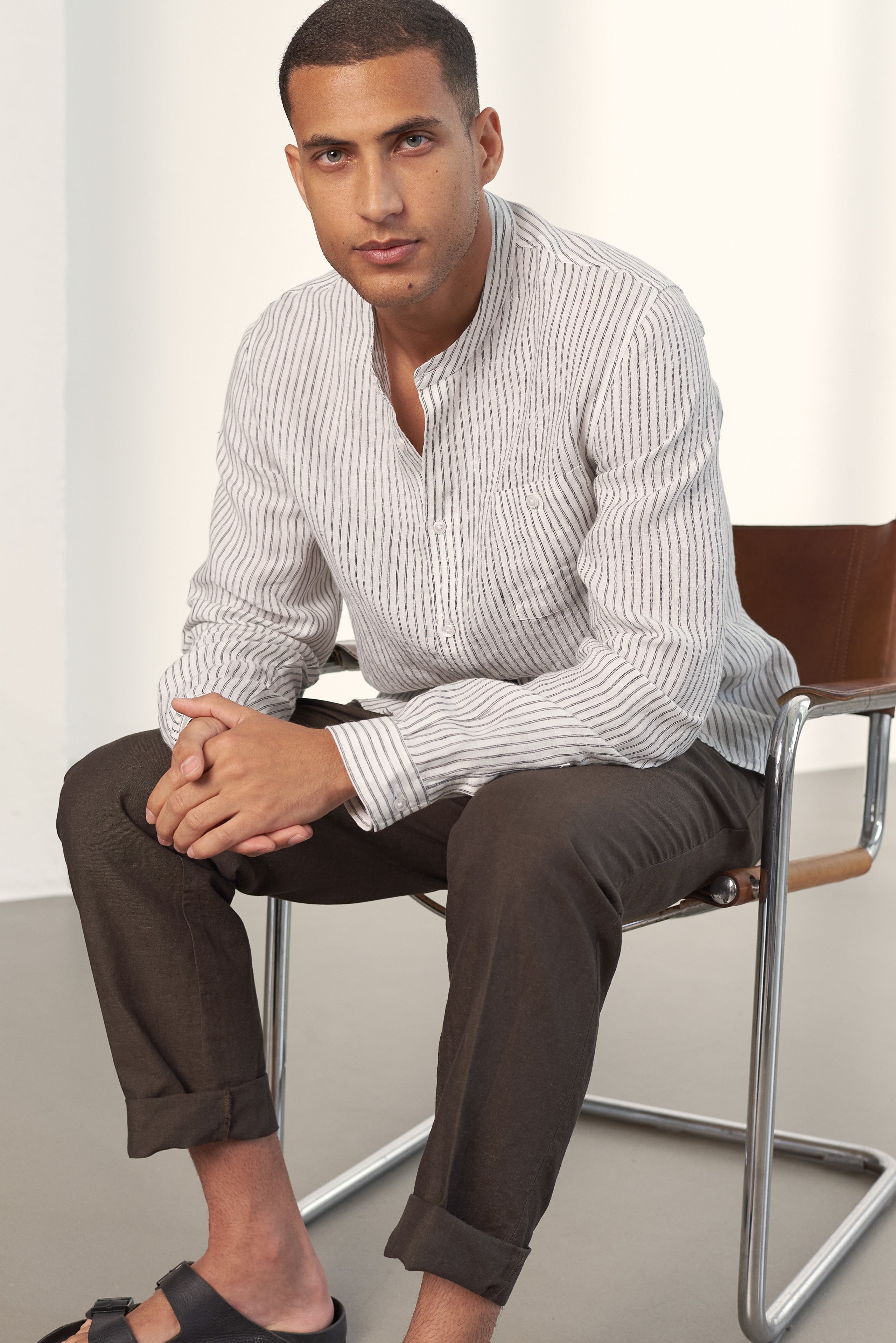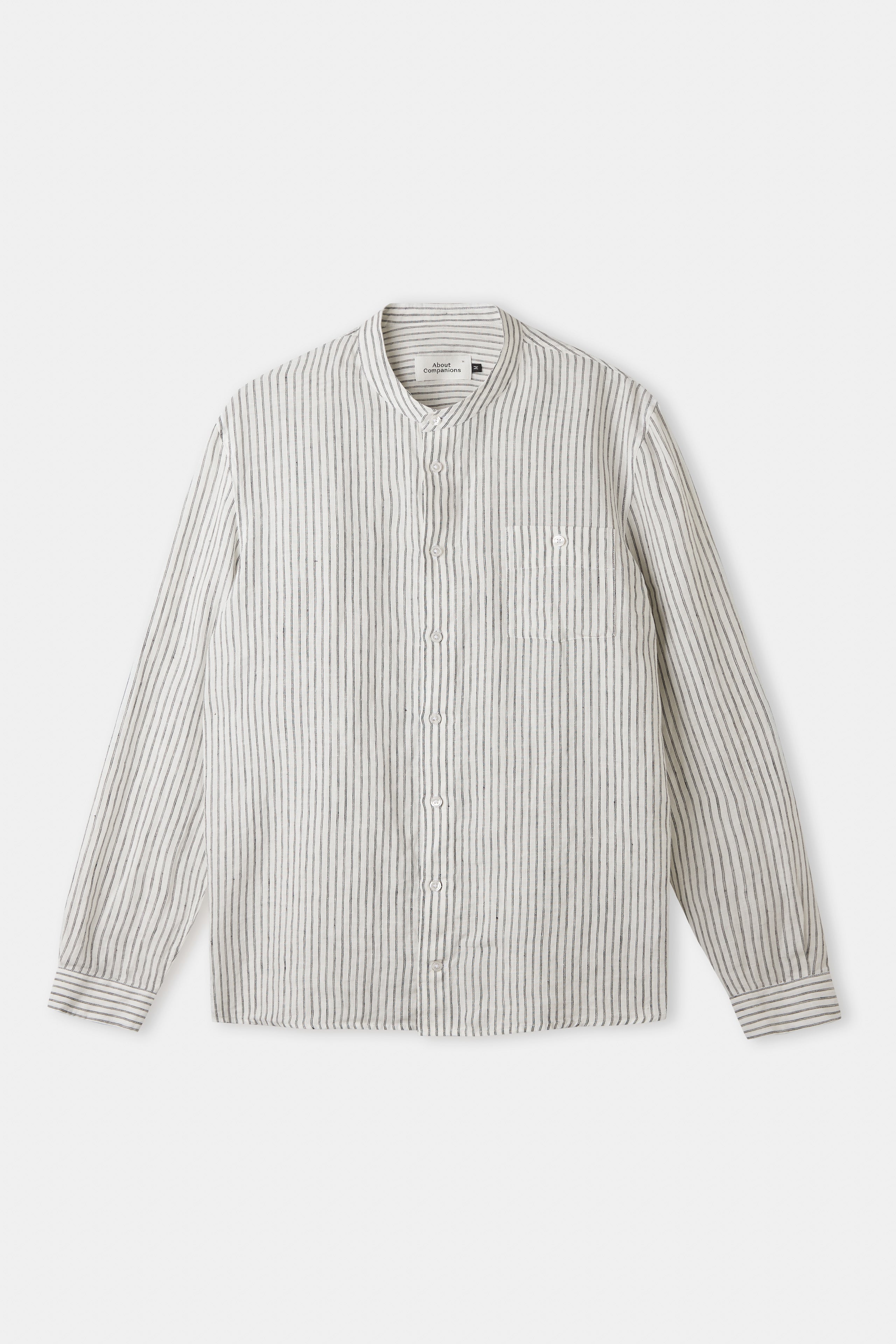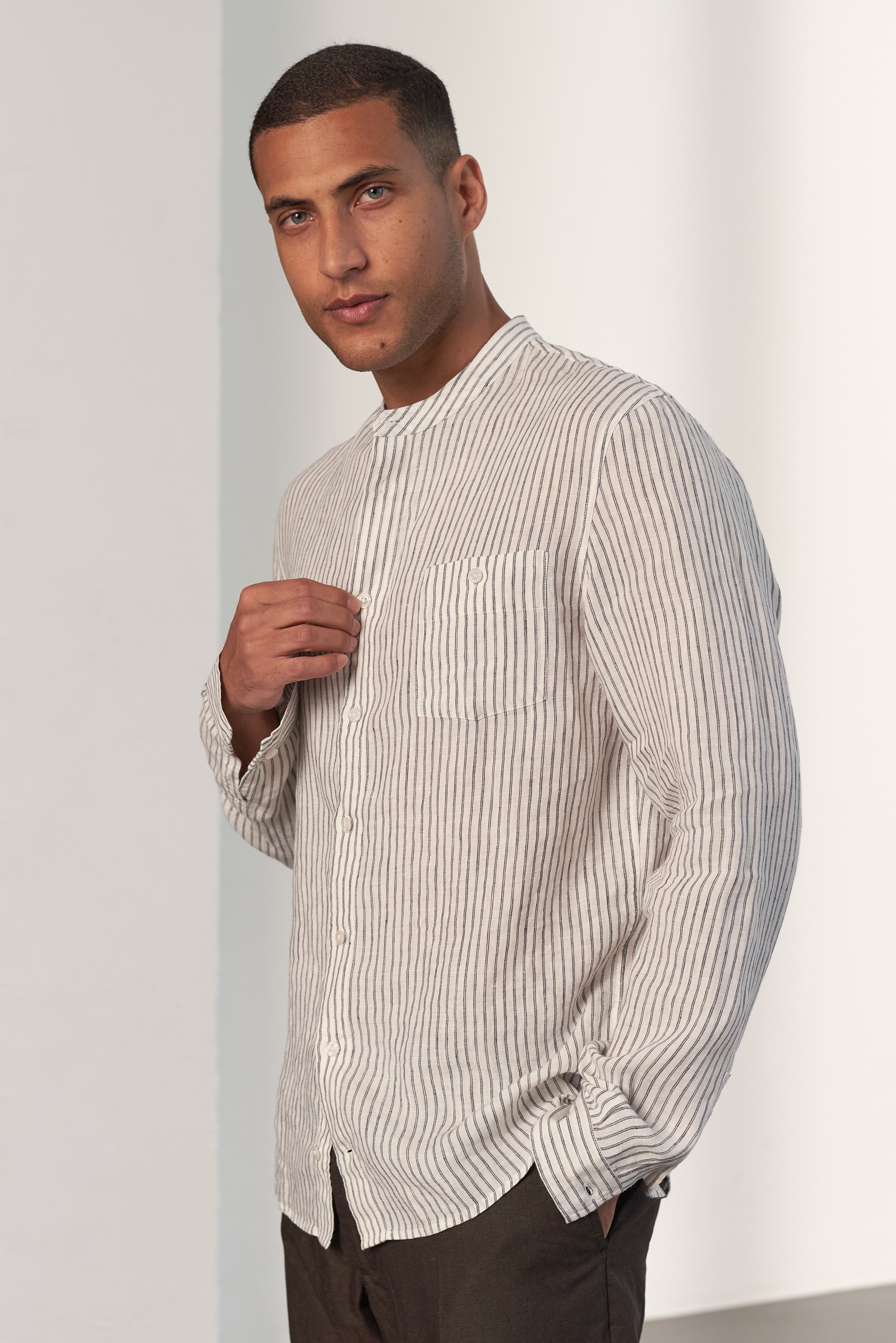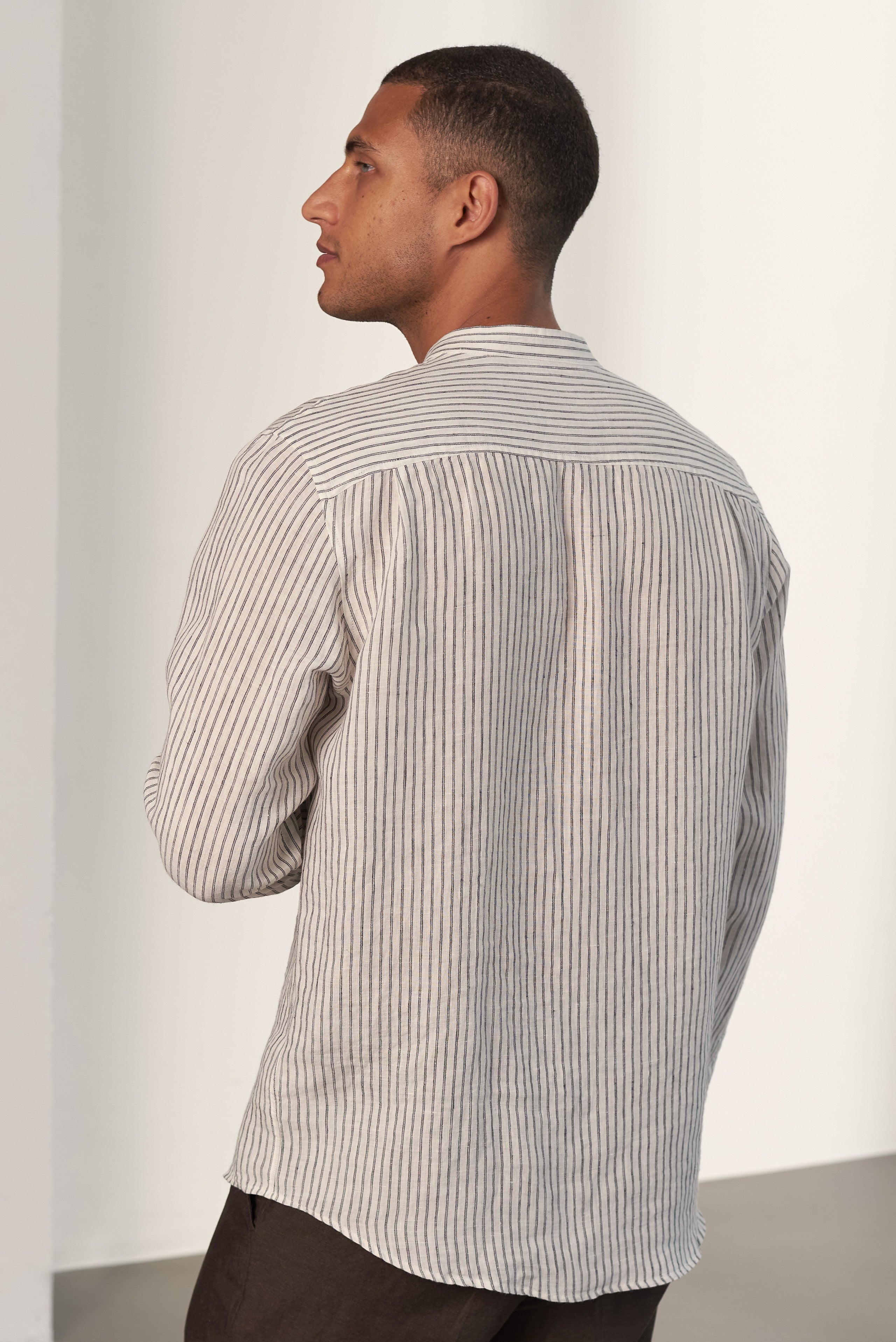 Introducing our sophisticated shirt with a stand-up collar and minimalistic design. Crafted from high-quality linen fibers, sourced from Normandy and woven by skilled Lithuanian partners. Stay naturally cool during hot summer days with the breathable fabric. Features a chest pocket and vegan buttons, and the pre-washed fabric ensures no shrinkage. Ethically made in Lithuania.