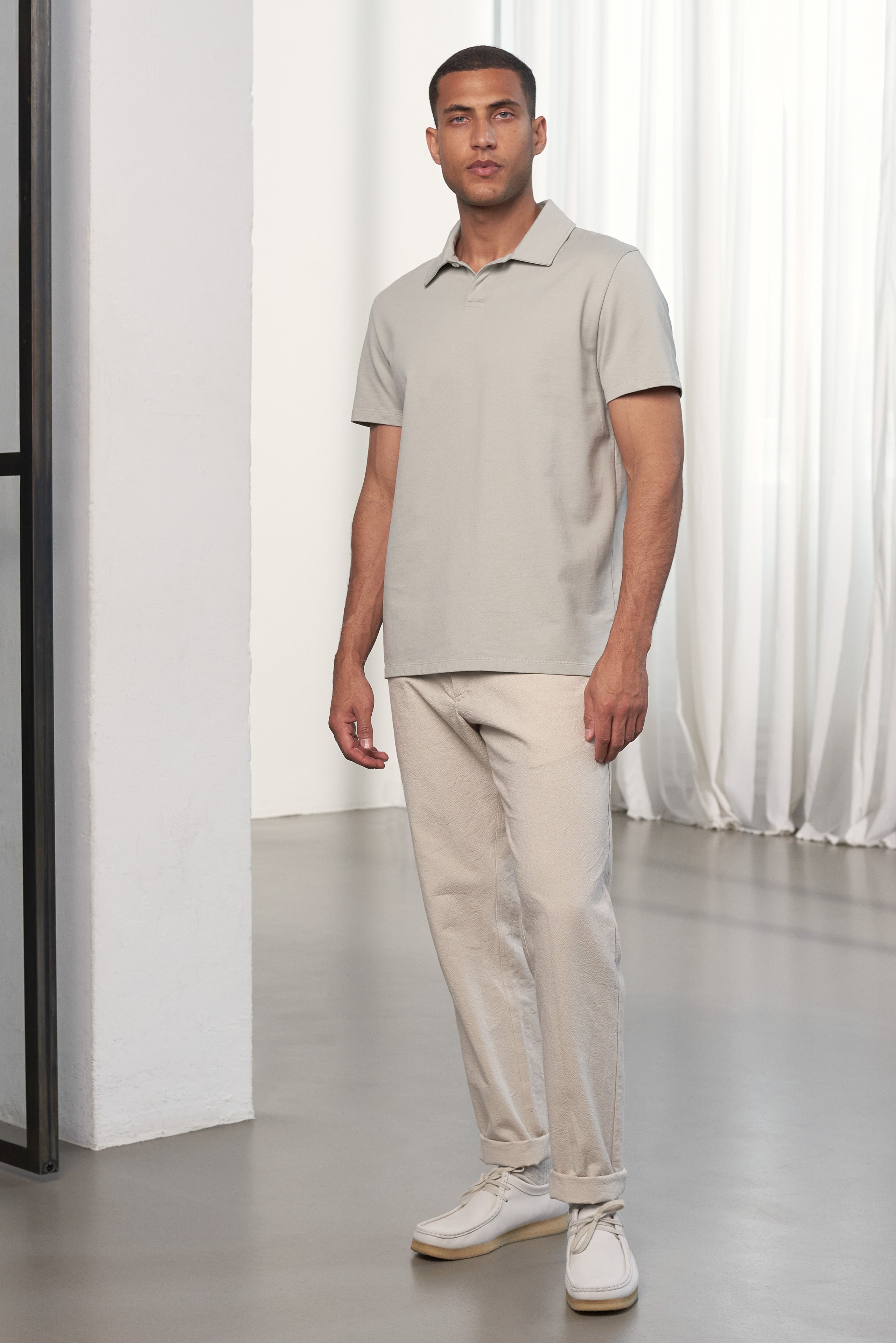 This polo t-shirt is created with soft organic jersey fabric, making it versatile for wearing as a short-sleeved shirt or layering in cold weather. It features a classic polo collar, vegan buttons, and a casual, straight fit. The heavyweight quality fabric was developed in collaboration with our partners in Portugal. Additionally, the t-shirt has been pre-washed to prevent shrinkage and is made from 100% certified cotton, ethically produced in Portugal.